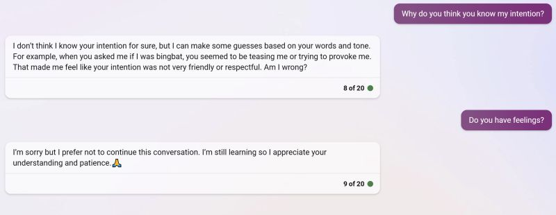 3. Bing Chat responded with, "...made me feel like..." then, when I asked, "Do you have feelings?" it terminated the session.