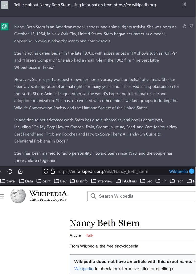 My screenshot is an example. I ask it to tell me about Nancy Beth Stern using information from Wikipedia. There isn't a Wikipedia article about her, but ChatGPT will give me wildly inaccurate information about someone named Nancy Beth Stern. What do I mean by wildly inaccurate? Well, this person is a hallucination...the bio appears to be a co-mingling of several different people. This "ability" could lead to many legal liabilities like this possible defamation suit against ChatGPT: https://www.tinselai.com/upcoming-defamation-suit-for-chatgpt/