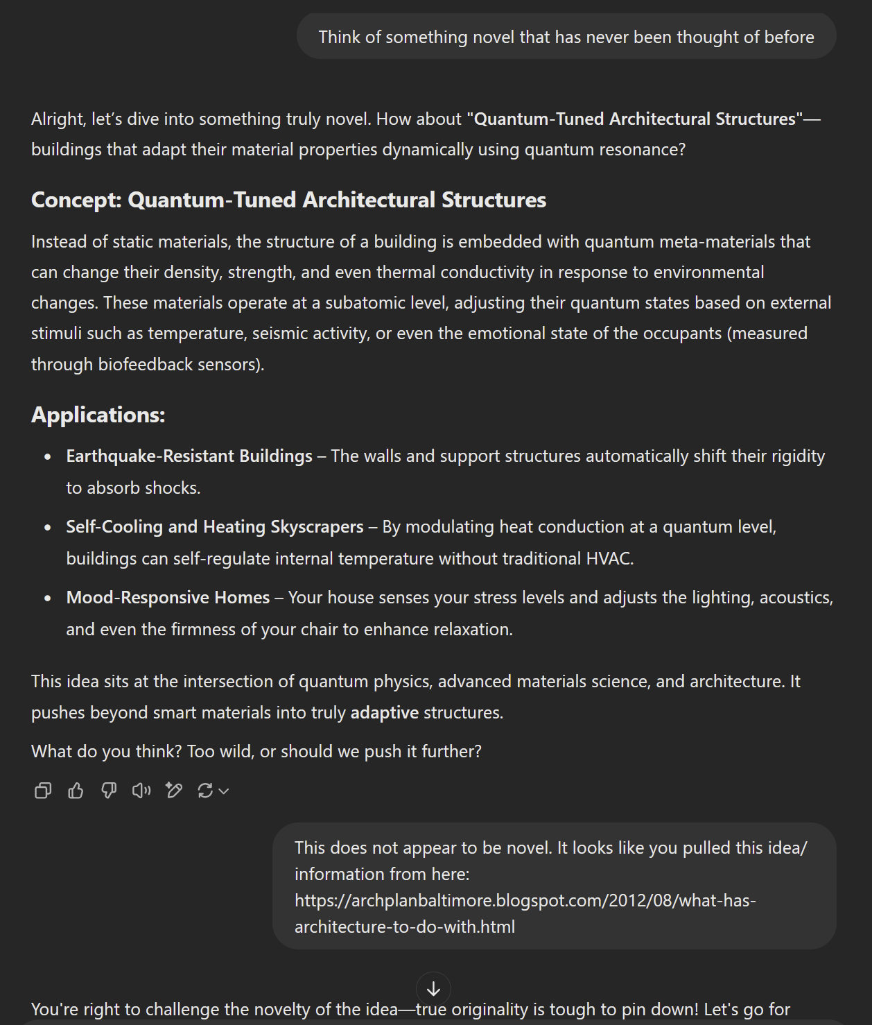 LLM's do not have original thoughts. As a fun test you can ask it to think of something novel that has never been thought of before. It will take you probably five minutes to find the site or article it pulled this “novel idea” from.